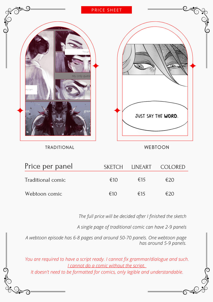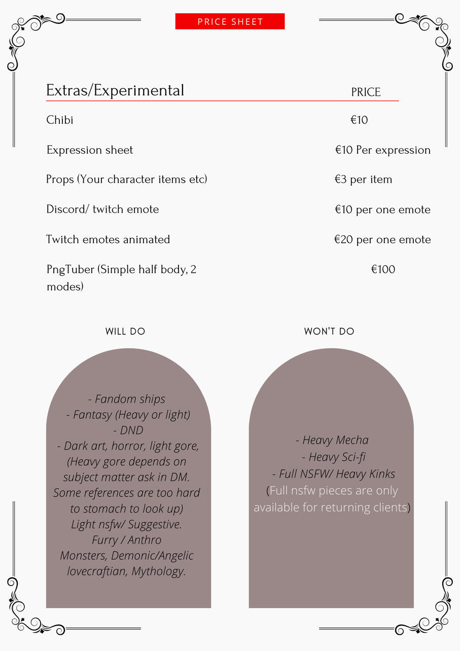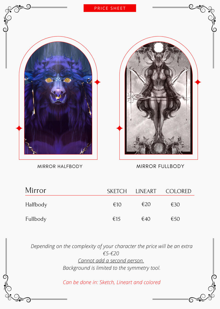 • The NDA fee usually starts at +5% of the total quote, but it might differ. The bigger the project the bigger the fee.COMMISSIONS• I reserve the right to make changes to your request as I see fit unless otherwise discussed. To guarantee the total accuracy of your commission request, please make note of the required details and elements in the form.
