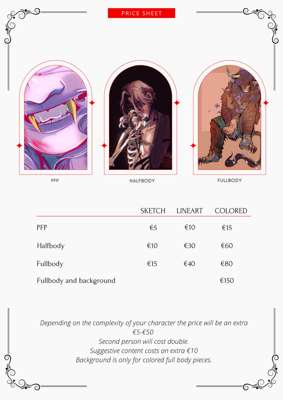 • The NDA fee usually starts at +5% of the total quote, but it might differ. The bigger the project the bigger the fee.COMMISSIONS• I reserve the right to make changes to your request as I see fit unless otherwise discussed. To guarantee the total accuracy of your commission request, please make note of the required details and elements in the form.