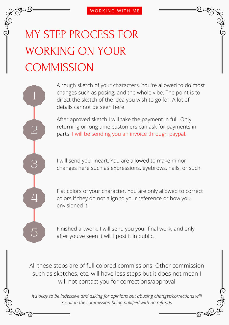 • I will not redraw a completed commission unless payment is received for a second order.FINAL PRODUCT• The commissioner must respect that my artistic style cannot be altered.
